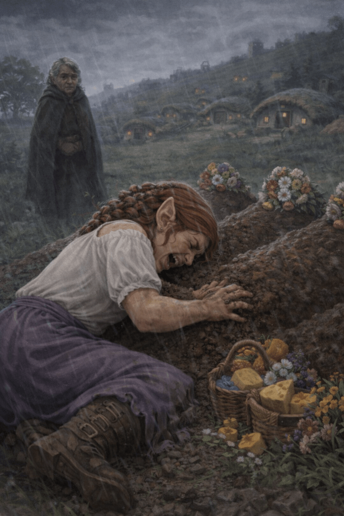 Melia made the trek down from the foothills back to the burrows, ignoring the package and note in her grief-stricken state. Field wardens tried to warn her about the dark business that had occurred, but she walked past them without acknowledgment until her mother-in-law Helena Havelock appeared, her face marked with soot and looking older than Melia remembered. When Melia could only speak the names of her lost family, Helena nodded and pointed behind the burrows to a partially cleared field where four new mounds marked the graves of Nicker, Petal, Boberry, and Belfast, decorated with flowers, baskets, breads, and cheeses left by other halflings who had paid their respects.