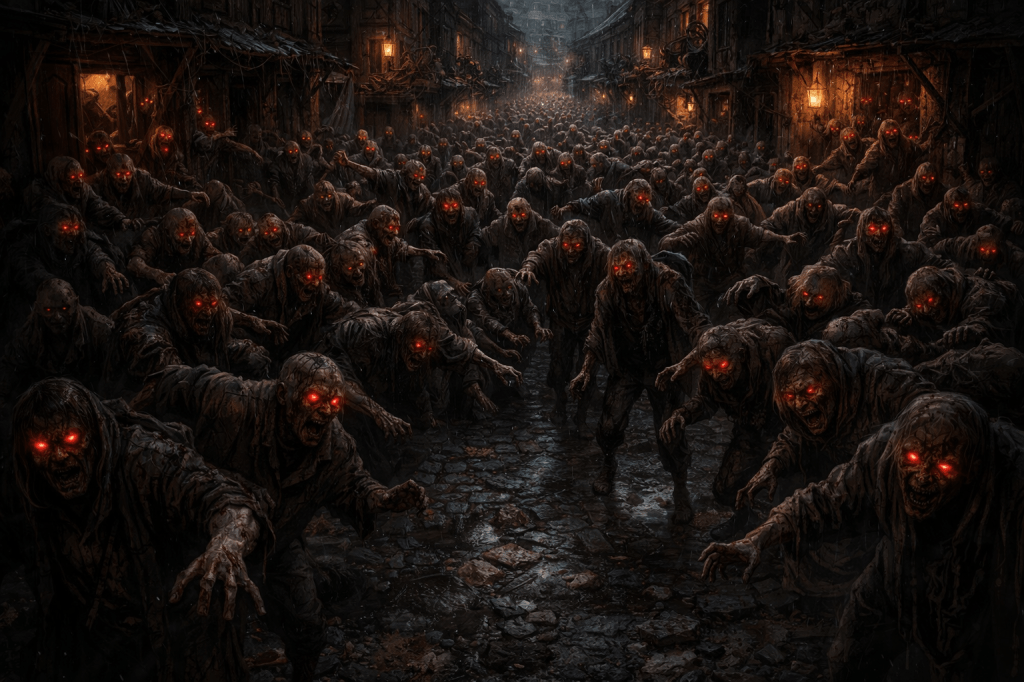 spilled from both sides into the mouth of the street they were on, eclipsing the courtyard and the well beyond. Denizens of the Narrows – shapes made thin and haggard by neglect and hunger, but also marked by faint runes on their faces and arms, a dim, dark, red glow to their eyes, and glistening remains of the foul goo at their lips, running down their chins, and on their torn tunics. The group found themselves entirely surrounded, the mass of bodies flooding the streets like a reddish, angry wave, arms reaching to grasp, tear, and break…